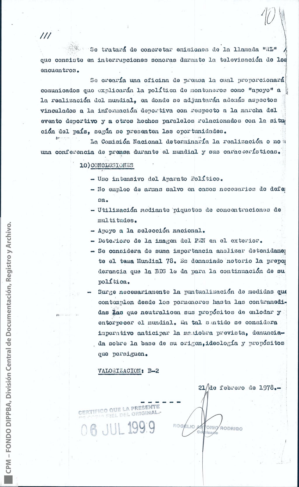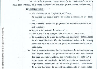 El mismo informe, fechado el 21 de febrero de 1978, bajo el asunto “accionar de la BDS Montoneros con relación al EAM 78”, anuncia en sus conclusiones: “Surge necesariamente la puntualización de medidas que contemplen desde los pormenores hasta las contramedidas las que neutralicen sus propósitos de enlodar y entorpecer el mundial. En tal sentido se considera imperativo anticipar la maniobra prevista, denunciada sobre la base de su origen, ideología y propósitos que persiguen”.