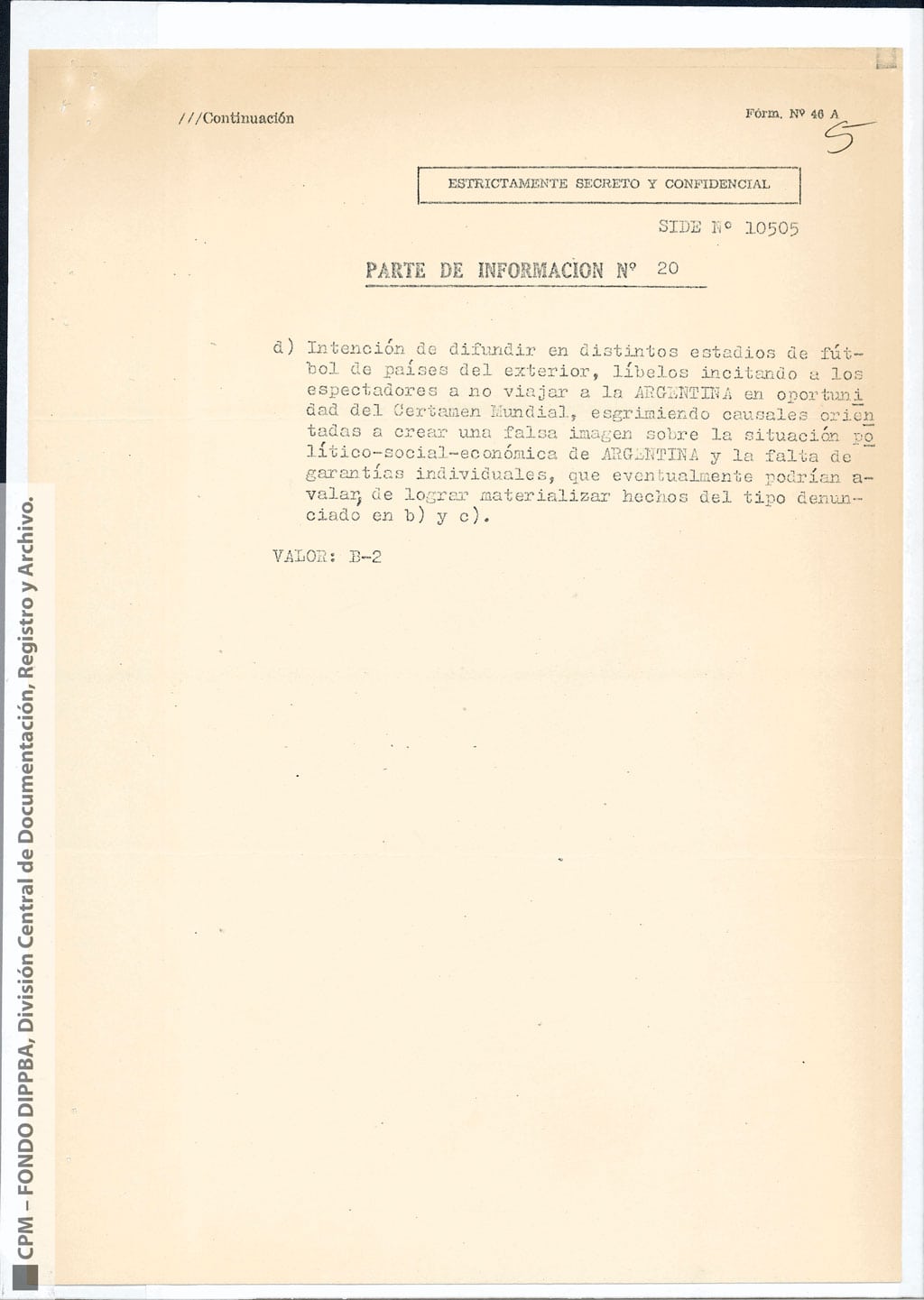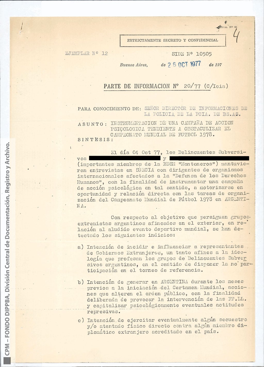Todos los elementos de sospecha sobre el supuesto boicot al mundial se presentan con claridad en el legajo de la SIDE Nº 10505, del 26 de octubre de 1977, elaborado sobre la base de información de Contrainteligencia valorada como B2, es decir, de fuente “normalmente” confiable y “muy probable”. El documento catalogado como Parte de Información Nº 20/77 (C/Icia), y para poner en conocimiento del “Director de Informaciones de la Policía de la Pcia. De BS. AS.”, lleva el asunto: “Instrumentación de una campaña de acción psicológica tendiente a obstaculizar el campeonato mundial de fútbol 1978”.