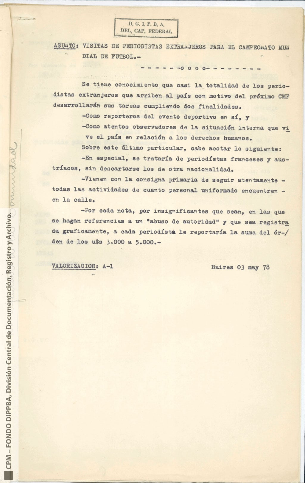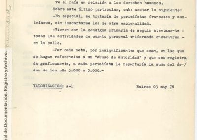En el informe se advierte que “casi la totalidad de los periodistas desarrollarán sus tareas como atentos observadores de la situación interna que vive el país en relación a los derechos humanos” y agrega: “Cabe acotar lo siguiente: en especial, se trataría de periodistas franceses y austríacos, sin descartarse los de otra nacionalidad; vienen con la consigna primaria de seguir atentamente todas las actividades de cuando personal uniformado encuentren en la calle; por cada nota, por insignificante que sean, en las que se hagan referencias a un ‘abuso de autoridad’ y que sea registrada gráficamente, a cada periodista le reportaría la suma del orden de los u$s3.000 a 5.000”.